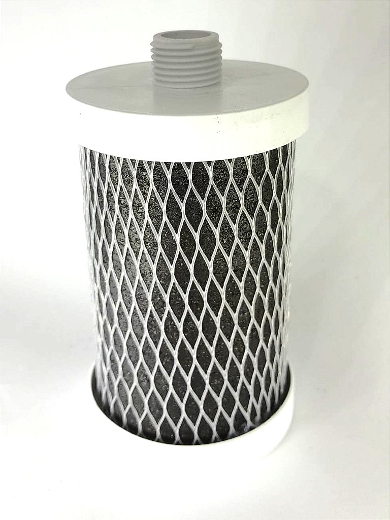 Carvão ativado com prata coloidal. A prata coloidal evita a proliferação de bactérias no elemento filtrante.