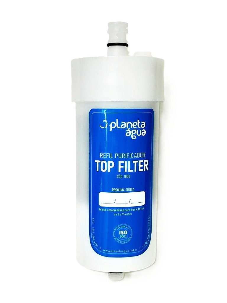 Refil TOP FILTER - Compatível com Purificadores Top Filter Planeta Água, Durin H20, Impac Cristal, Mallory e Mondial, Cartucho de tripla filtração. Sendo o 1º estágio de polipropileno de 5 micra para retenção de material particulado, o segundo estágio é constituído por carvão ativado granulado com prata coloidal para retenção de contaminantes químicos (cloro) e mais um 3º estagio em polipropileno de 3 micra de retenção responsável pelo polimento final.